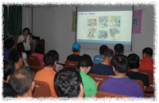 ㅇ 일시 : 2014. 7. 10(목) ㅇ 대상 : 직업훈련생 및 이용자 40명 ㅇ 강사 : 배명옥(YWCA성폭력 상담소) ㅇ 내용 : 성폭력 개념 및 사례소개