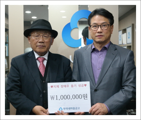 부여 새마을금고(이사장 장영석)에서 장애인분들을 위해 써달라며 일백만원을 후원해주셨다. 평소 지역복지 발전을 위해 앞장서시는 이사장님 외 직원분들께 다시 한번 감사드린다.