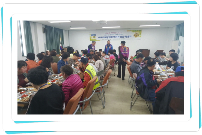 부여라이온스클럽(회장 조형식) 점심식사 나눔 봉사활동을 펼쳤다. 작년에 이어 복지관을 다시 찾은 부여라이온스클럽 회원들은 생업을 뒤로 하고 복지관 이용 장애인 150여명에게 특별한 점심식사를 준비해 주었다. 한편, 부여라이온스클럽 회원이기도한 이용우 부여군수는 직접 배식에 참여하여 장애인과 함께 하며 부여군의 장애인 복지사업에 대한 의지를 다졌다는 후문이다. 정도기 관장은 "이웃사랑을 몸소 실천하는 후원자에게 감사하며 앞으로도 이웃을 사랑하고 돌보는 문화가 확산될 수 있도록 최선을 다하겠다"고 말했다.