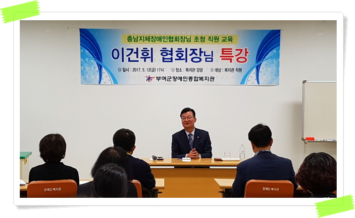 2017년 5월 12일 충남지체장애인협회(회장 이건휘)에서 부여군장애인복지관 직원을 대상으로 특별강의를 실시 하였다.