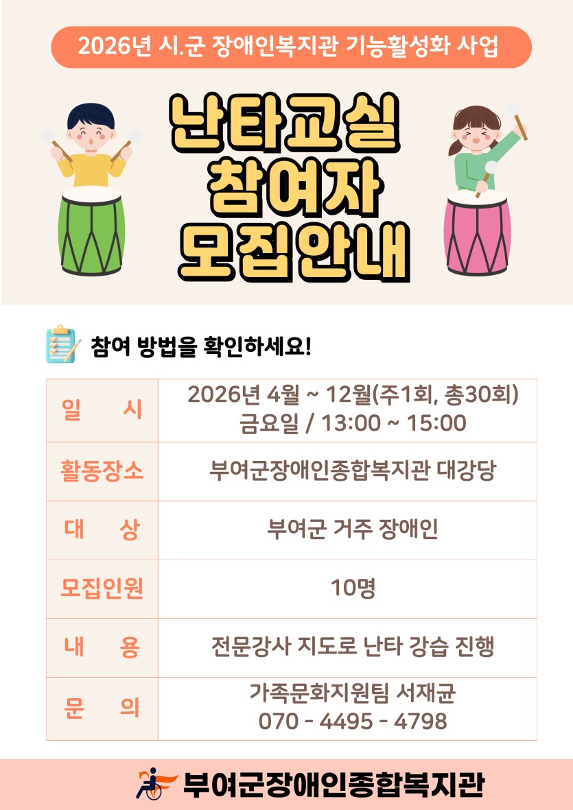 2026년 난타교실 참여자 모집 안내 게시글 작성정보 작성자 worbs 작성일 26-03-25 15:10 조회수 1 댓글수 0 목록 게시글 본문 2026년 난타교실 참여자 모집합니다 첨부파일 1개 난타교실 참여자 모집.jpg (857.7K) 0회 다운로드 첨부일시 : 2026-03-25 15:10:23 다음글 사물놀이 초급반, 중급반 참여자 모집 안내 26-03-06 댓글 0 등록된 댓글이 없습니다. 목록