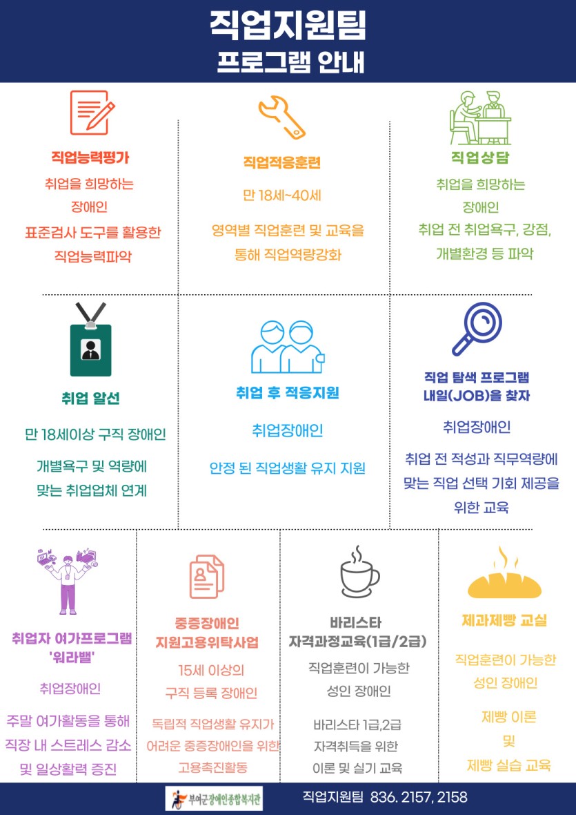 2024년 직업지원팀 프로그램 이용안내 게시글 작성정보 작성자 부여군장애인종합복지관 작성일 24-01-15 16:33 조회수 2,753 댓글수 0 목록 게시글 본문 첨부파일 1개 직업지원팀 안내문.jpg (374.3K) 2회 다운로드 첨부일시 : 2024-01-15 16:33:49 이전글 취업을 희망하는 장애인 구직자를 위한 직업지원 서비스 안내 24-01-16 다음글 1월 3주 주간업무 추진계획 24-01-15 댓글 0 등록된 댓글이 없습니다. 목록