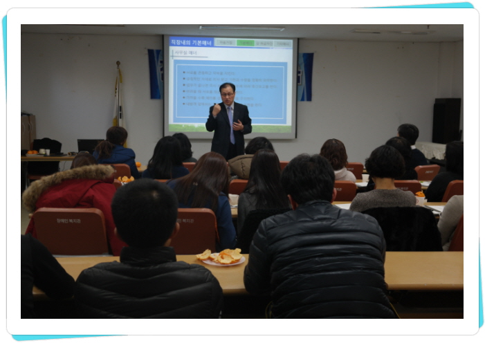 ㅇ 일시 : 2014. 1. 2 ~ 3 ㅇ 장소 : 복지관 강당 ㅇ 대상 : 전 직원 ㅇ 강사 : 박상진, 강석동 ㅇ 내용 : 직장예절교육, 직장내 성희롱예방교육, 직원인권교육, 조직역량강화교육