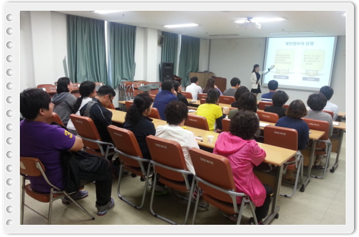 ㅇ 일시 : 2014. 5.24 17:00~18:00 ㅇ 장소 : 복지관 강당 ㅇ 인원 : 전직원 ㅇ 내용 : 개인정보보호교육