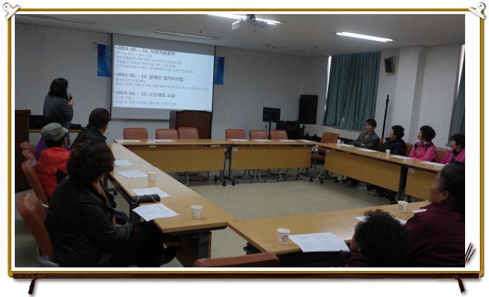 일시: 11월25일 시간: 10시~13시 장소: 강당 인원: 20명 내용 : 직업적응훈련생 연중 활동보고, 건의사항 청취 등