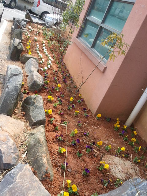 복지관 화단에 이용자들과 팬지꽃을 심었습니다. 꽃은 규암면사무소에서 주셨는데, 감사드립니다.