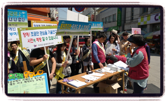 지역의 봉사단체와 학생, 직원들이 함께 참여한 가운데 지난 토요일(4.25) 부여 읍 중심가에서 "2015년 장애인식개선캠페인" 이 실시되었다. 인식개선홍보지 배포와 피켓팅, 설문조사 등 다양한 활동으로 진행된 이날 행사를 통해 많은 지역분들에게 조금이나마 장애에 대한 올바른 인식을 심어주었으리라 믿는다.