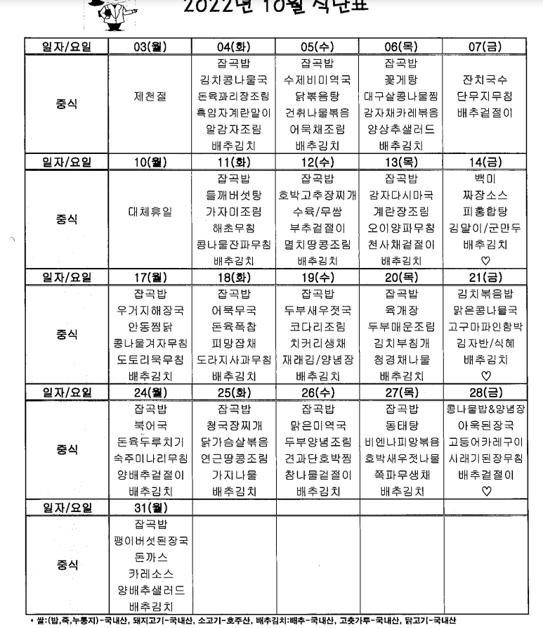 10월식단표 게시글 작성정보 작성자 부여군장애인종합복지관 작성일 22-10-04 08:59 조회수 3,267 댓글수 0 목록 게시글 본문 10월 식단표입니다. 첨부파일 1개 2022년 10월.png (174.7K) 3회 다운로드 첨부일시 : 2022-10-04 08:59:24 이전글 10월 월간계획 22-10-06 다음글 2022년 참여자 인권교육 안내 22-09-26 댓글 0 등록된 댓글이 없습니다. 목록